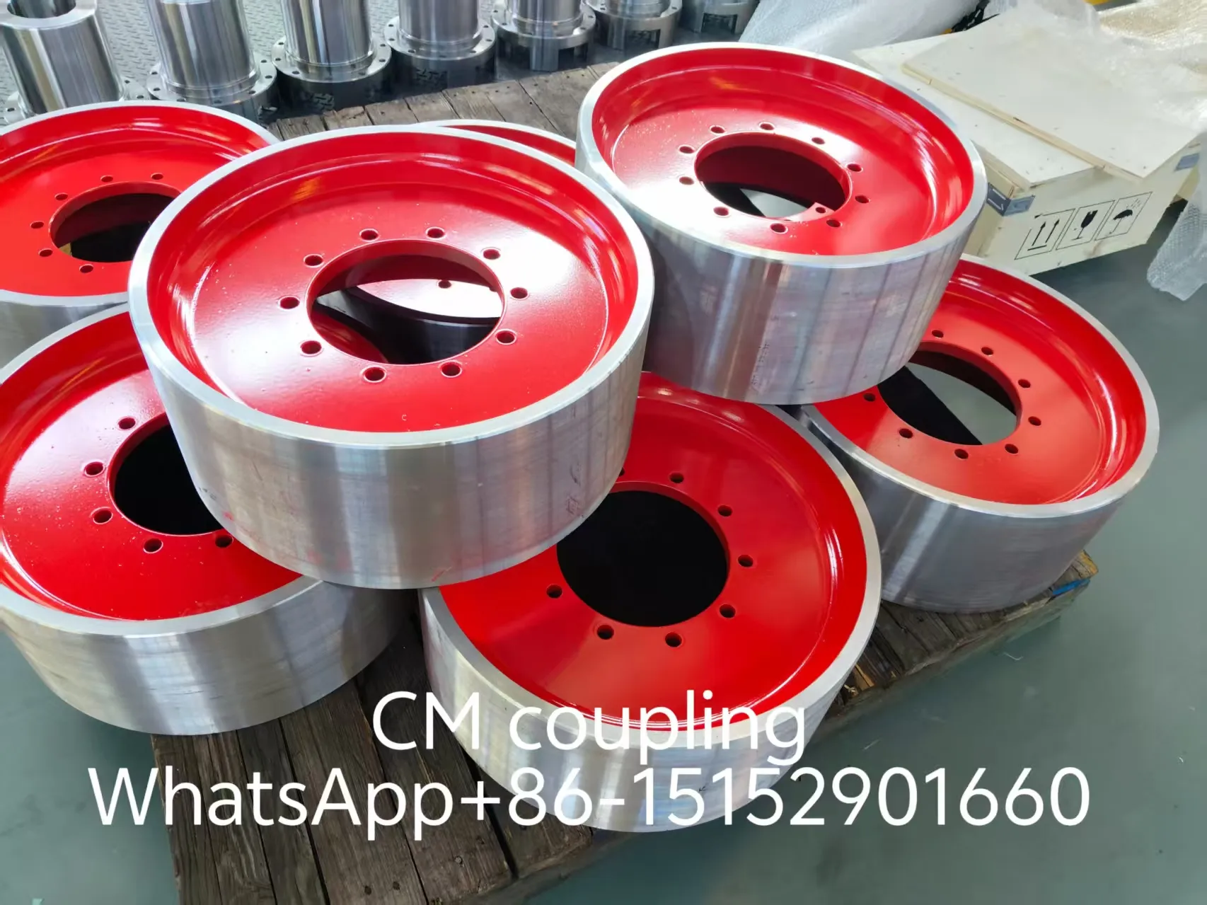 Estruturalmente, uma roda de freio de acoplamento normalmente consiste em um corpo de roda de metal, um flange de conexão e uma superfície de fricção de frenagem. O corpo da roda é frequentemente feito de aço fundido de alta resistência ou forjados de liga para garantir resistência ao impacto e fadiga sob cargas pesadas. A superfície de fricção passa por processos de tratamento térmico, como têmpera e cementação para aumentar a resistência ao desgaste e resistência ao calor. Os orifícios dos parafusos no flange são usados para alinhamento preciso com o eixo de transmissão e dispositivo de freio. O revestimento vermelho na roda de freio do tipo "acoplamento CM" na imagem não apenas fornece proteção contra ferrugem, mas também facilita a identificação e manutenção rápidas em ambientes industriais.